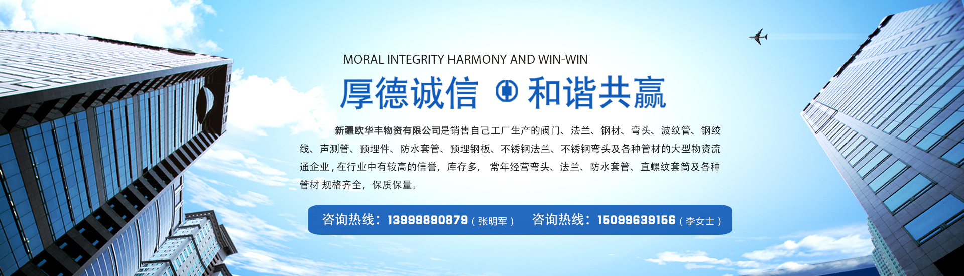 新疆歐華豐物資有限公司是銷售自己工廠生產(chǎn)的彎頭  法蘭  防水套管  及各種管材的大型物資流通企業(yè) , 在行業(yè)中有較高的信譽,庫存多,常年經(jīng)營閥門、法蘭、鋼材、彎頭、波紋管、鋼絞線、聲測管、預(yù)埋件、防水套管、預(yù)埋鋼板、不銹鋼法蘭、不銹鋼彎頭及各種管材 規(guī)格齊全,保質(zhì)保量。 公司一貫以: 服務(wù)上乘、質(zhì)量優(yōu)質(zhì)、價格合理、客戶至上、服務(wù)周到、讓利客戶、薄利多銷為原則,誠實守...